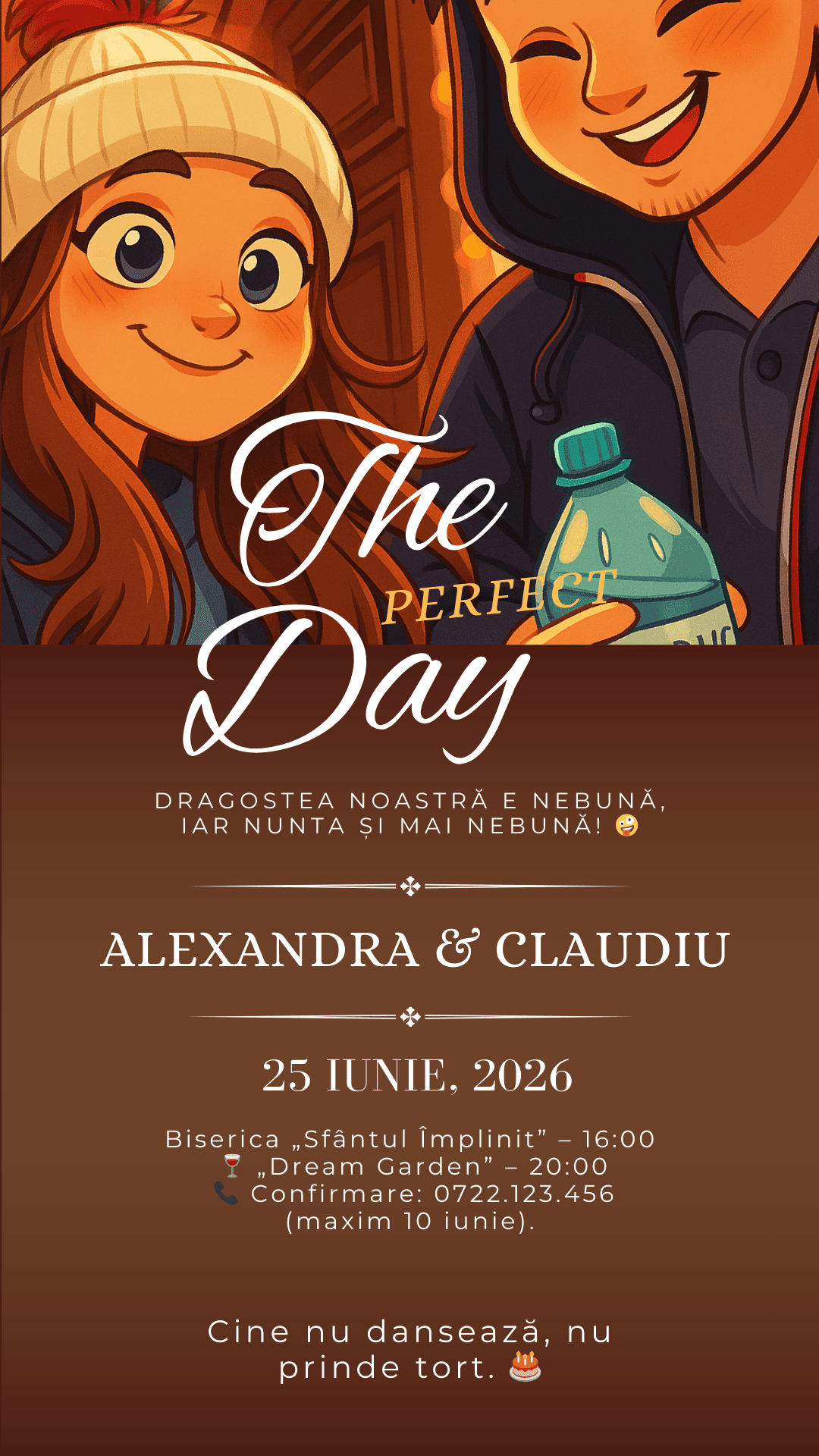 💌 Personalizare completăde la nume, locație, dată și oră, până la fotografii 📸 și mesaje text, fiecare detaliu este adaptat exact după cerințele tale. Tu decizi tonul invitației: elegant, romantic, amuzant sau modern.