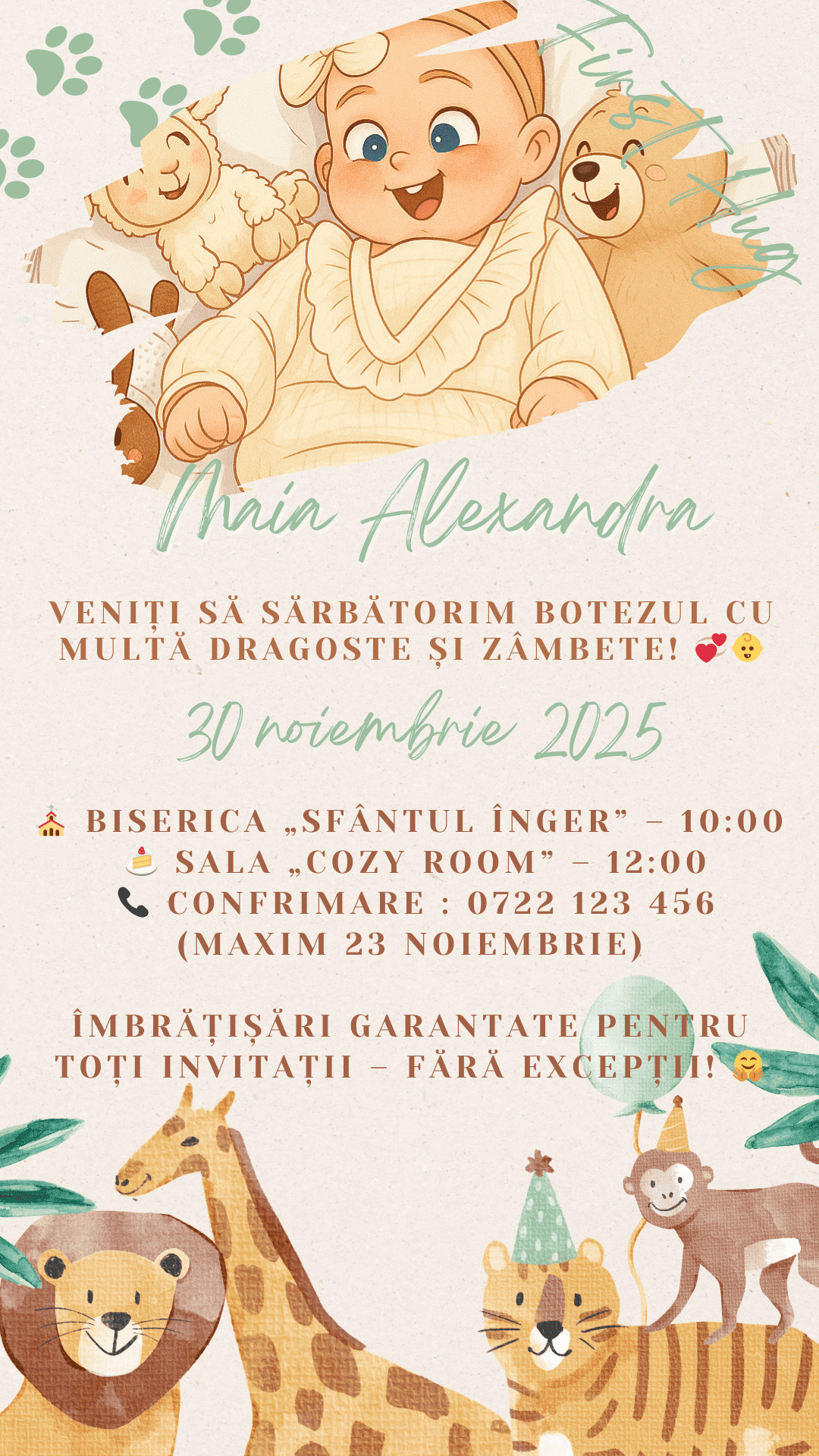 💌 Personalizare completăde la nume, locație, dată și oră, până la fotografii 📸 și mesaje text, fiecare detaliu este adaptat exact după cerințele tale. Tu decizi tonul invitației: elegant, romantic, amuzant sau modern.