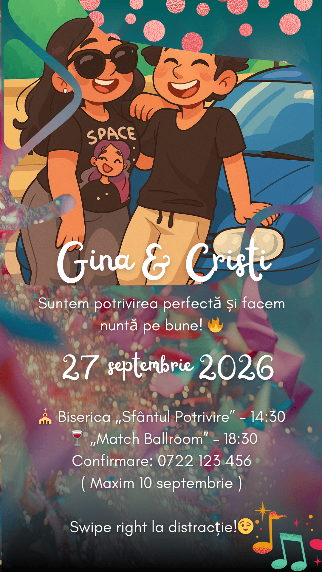 💌 Personalizare completăde la nume, locație, dată și oră, până la fotografii 📸 și mesaje text, fiecare detaliu este adaptat exact după cerințele tale. Tu decizi tonul invitației: elegant, romantic, amuzant sau modern.