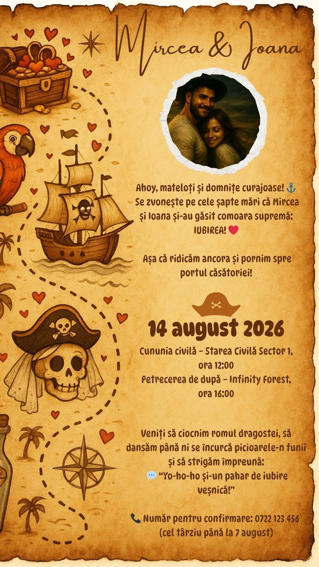 💌 Personalizare completă – de la nume, locație, dată și oră, până la fotografii 📸 și mesaje text, fiecare detaliu este adaptat exact după cerințele tale. Tu decizi tonul invitației: elegant, romantic, amuzant sau modern.