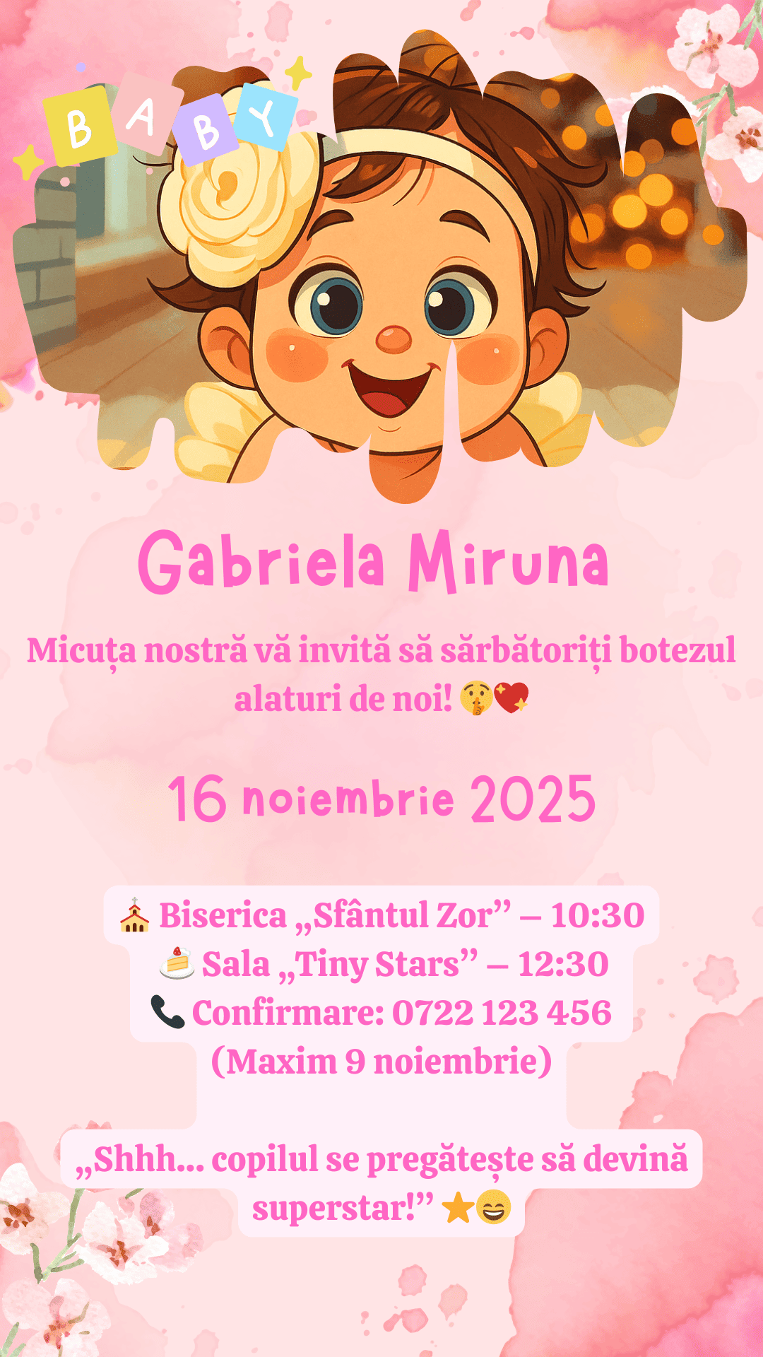 💌 Personalizare completăde la nume, locație, dată și oră, până la fotografii 📸 și mesaje text, fiecare detaliu este adaptat exact după cerințele tale. Tu decizi tonul invitației: elegant, romantic, amuzant sau modern.
